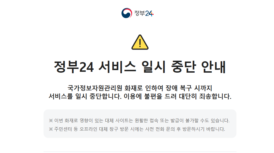 때마침 서류가 필요하여 정부24시에 접속하였는데 다음과 같은 메시지가 .... 나중에 알고보니 국가정보자원관리원에 화재가 있었다네요.