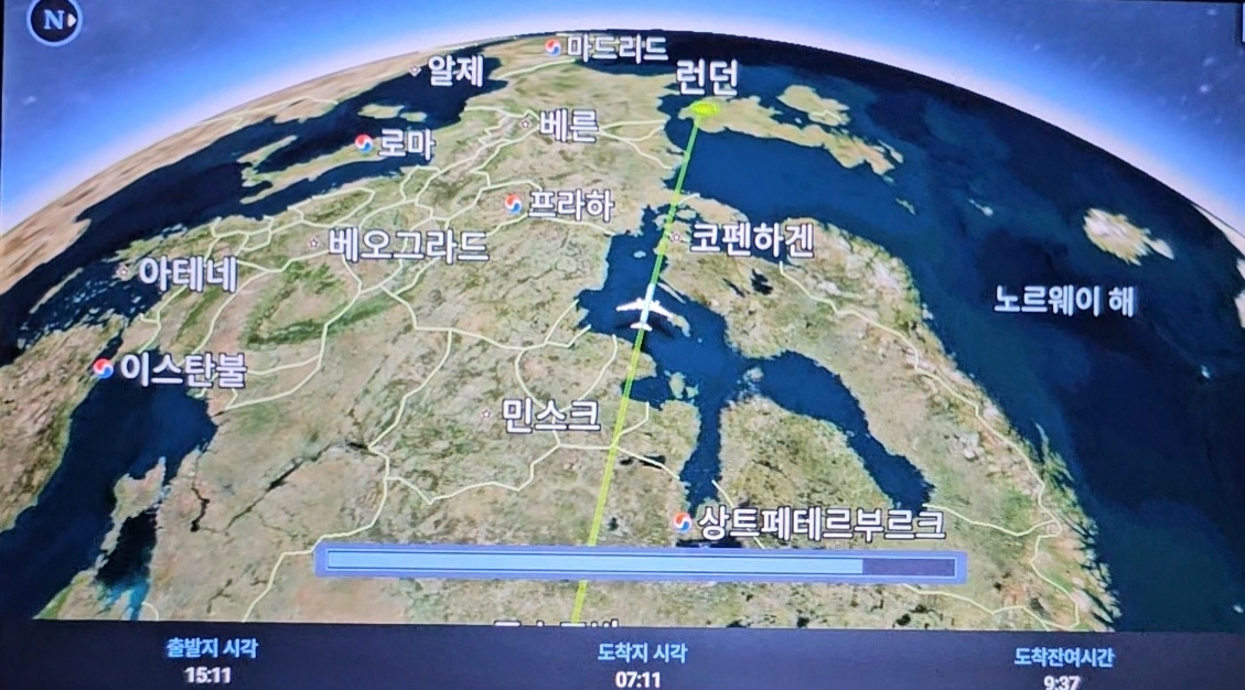 식사를 마친 후, 나는 창밖을 바라보며 사진을 찍기 시작했다. 예전 여행때는 분명 사진을 찍지 말아 달라고 했던 것 같다. 구름 위를 날아가는 비행기의 창문 너머로 펼쳐진 풍경은 말로 다할 수 없을 만큼 아름다웠다. 태양이 구름 사이로 비치는 모습은 마치 한 폭의 그림 같았고, 그 순간을 카메라에 담으며 시간을 보냈다. 항공 네비게이션 시스템을 통해 현재 위치와 외부 날씨, 그리고 구름의 정도 등을 살피는 것도 흥미로웠다.