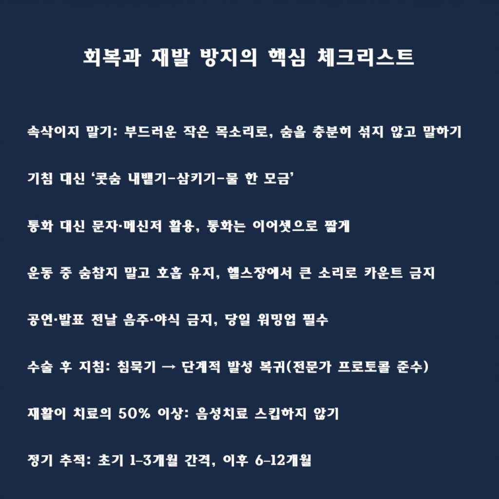 - 4–6주간 무리한 고성·노래 금지, 역류·흡연 절대 금물