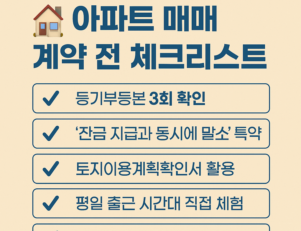 아파트를 구입할 때는 단순히 집을 보는 것을 넘어 다양한 법적, 재정적, 환경적 요소들을 종합적으로 따져봐야 한다. 다음은 아파트 구입 시 꼭 체크해야 할 핵심 항목들을 항목별로 정리한 내용이다.
