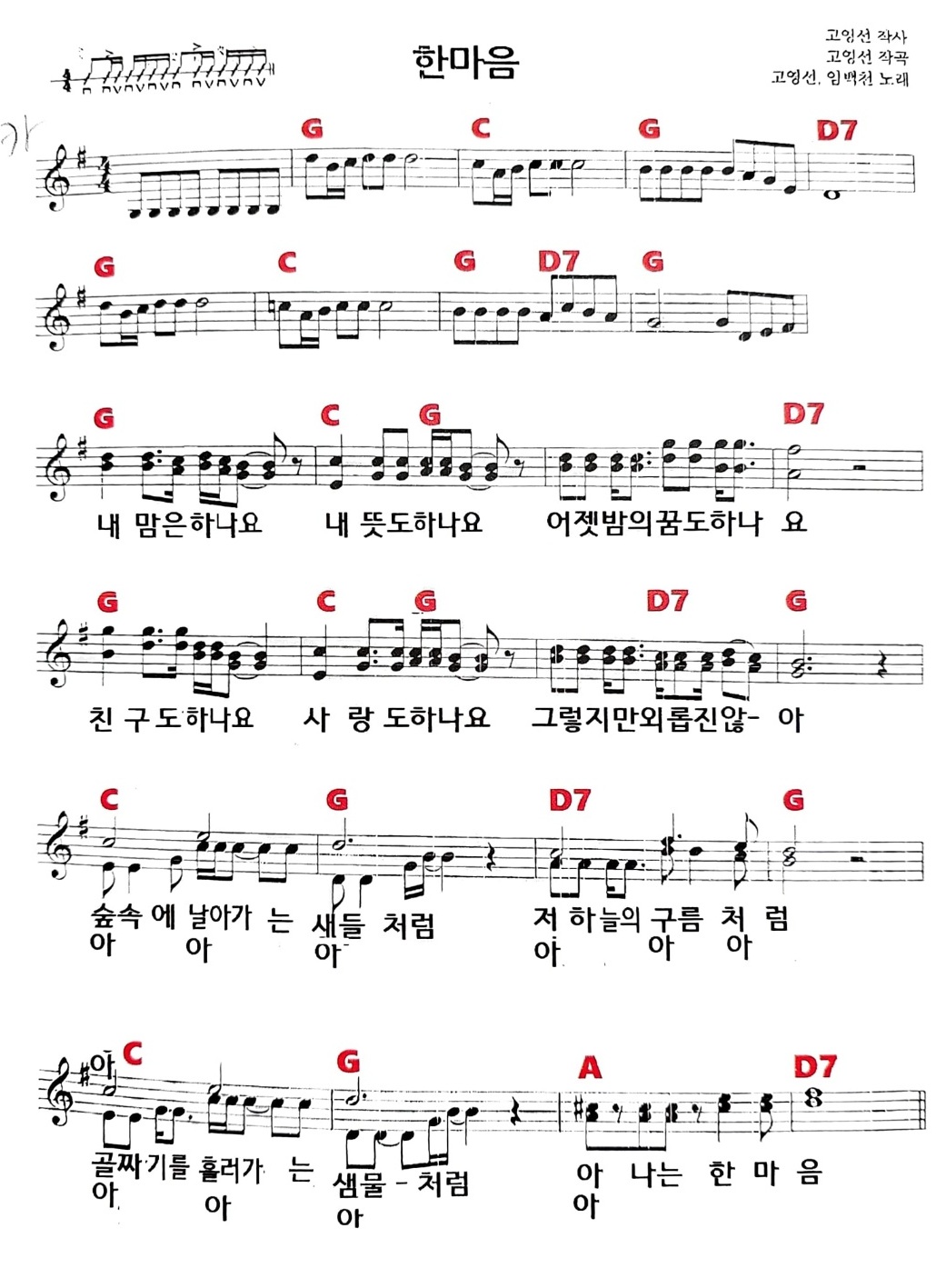 한마음 <임백천·고영선> 노래, 가사, 악보